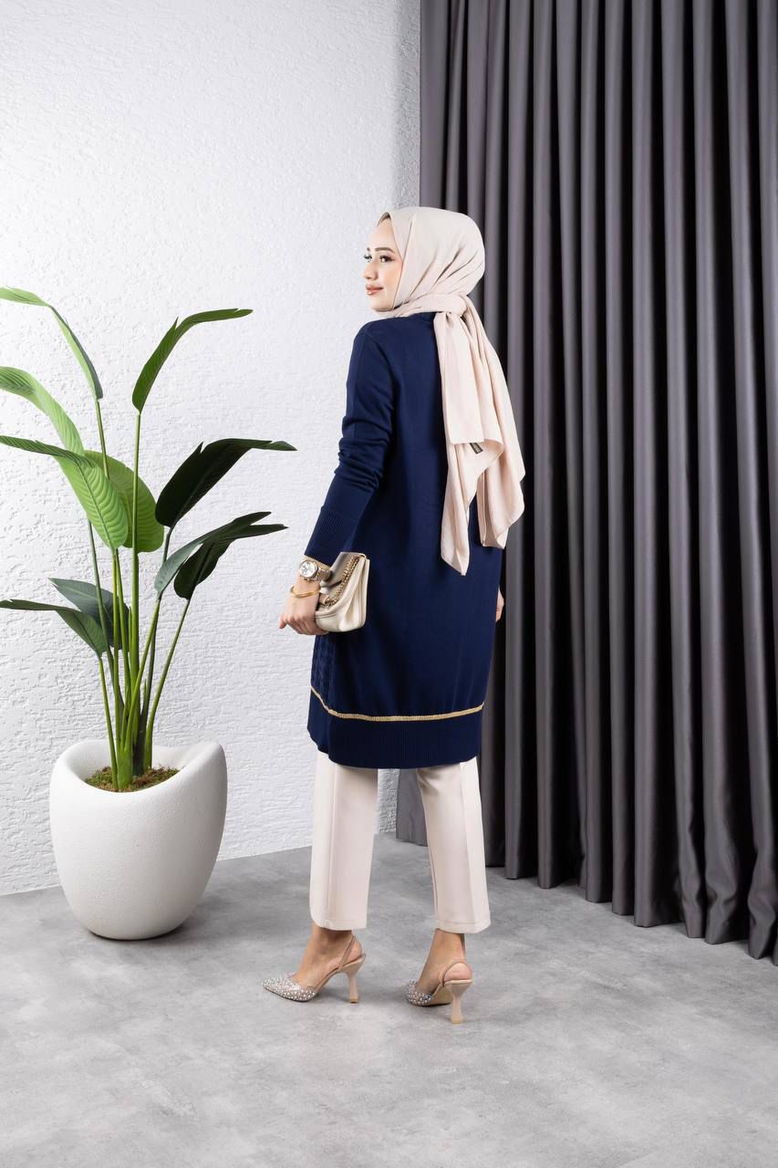 Bring luxury and elegance to your everyday wardrobe with this beautifully designed navy knitted cardigan. Crafted from a soft, high-quality knit, it features exquisite golden trimming and premium gold-toned buttons that create a sophisticated, regal look.